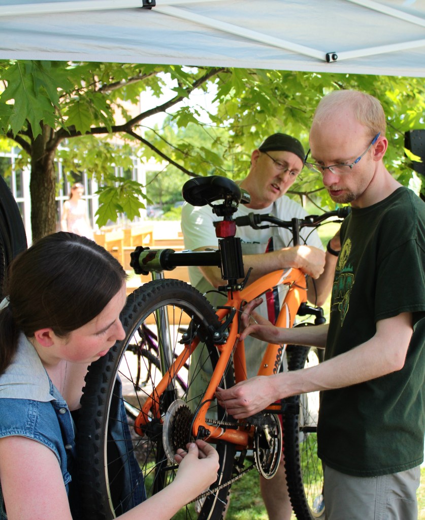 Our volunteers are available on Saturday mornings during the months of May and June at the Dexter Farmer’s Market. Schedule a visit with us where we can give it a bath and perform triage. We frequently replace tubes or tires, straighten wheels, lube chains, and adjust brakes or derailleurs.